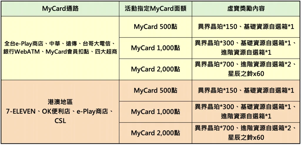 活動說明 : 活動期間內,至下列配合通路購買指定面額MyCard點數,並成功儲值進遊戲中,即可獲得相對應虛寶獎勵回饋。