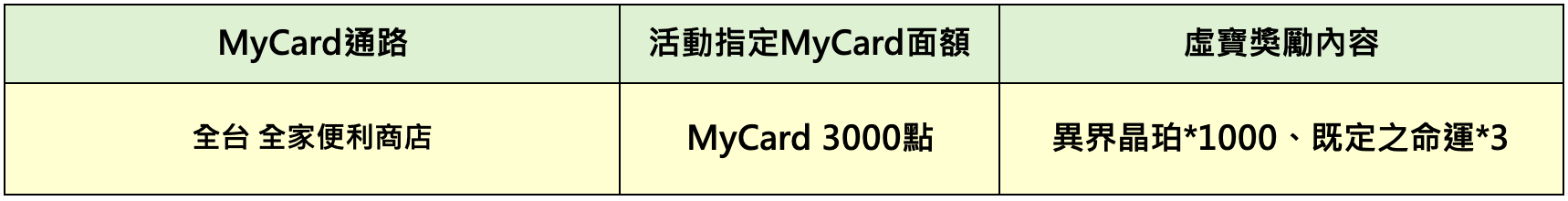 活動說明 : 活動期間內,至全家便利商店購買指定面額MyCard點數,並成功儲值進遊戲中,即可獲得相對應虛寶獎勵回饋。
