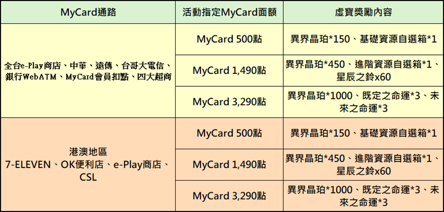 活動說明 : 活動期間內,至下列配合通路購買指定面額MyCard點數,並成功儲值進遊戲中,即可獲得相對應虛寶獎勵回饋。
