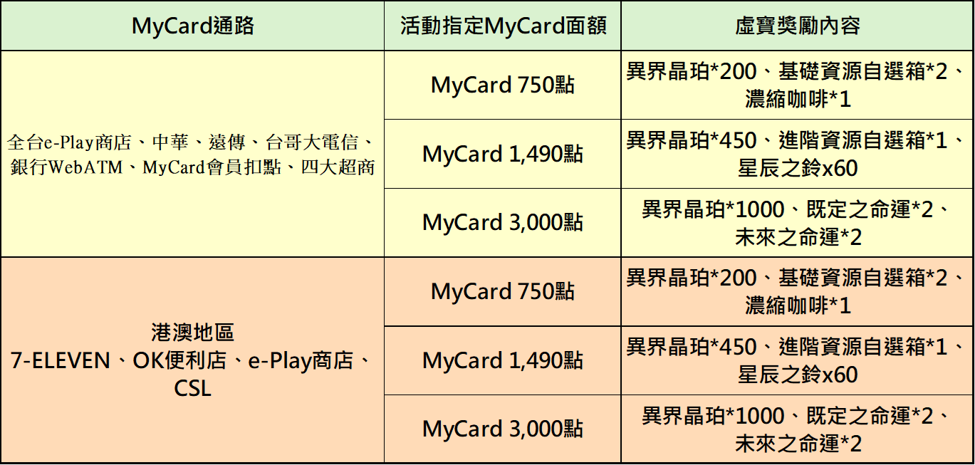 活動說明 : 活動期間內,至下列配合通路購買指定面額MyCard點數,並成功儲值進遊戲中,即可獲得相對應虛寶獎勵回饋。